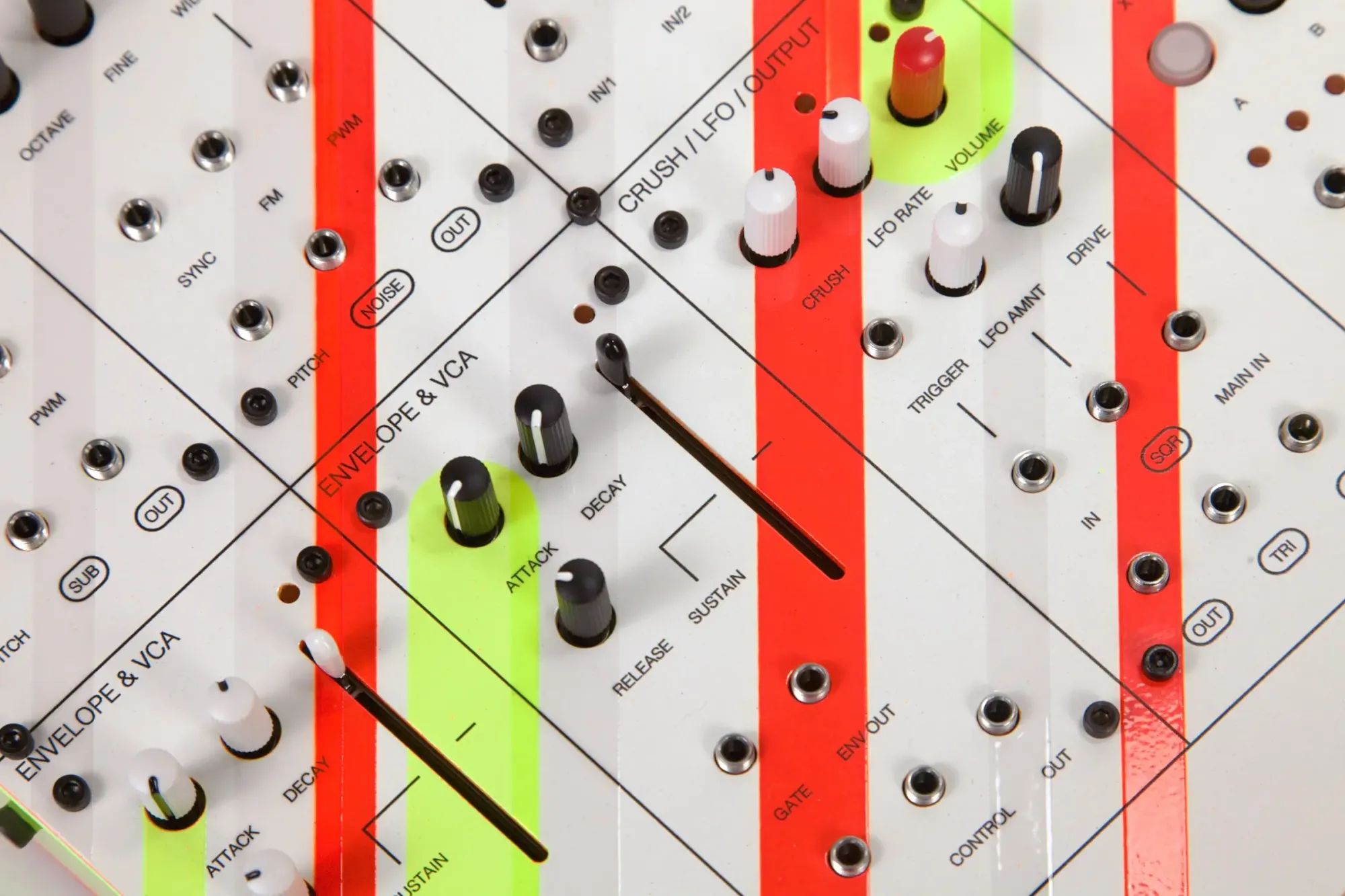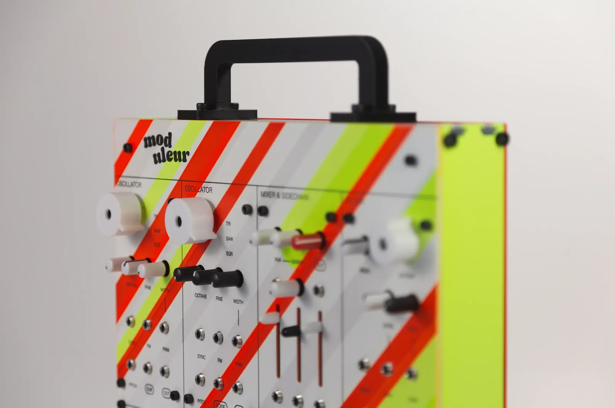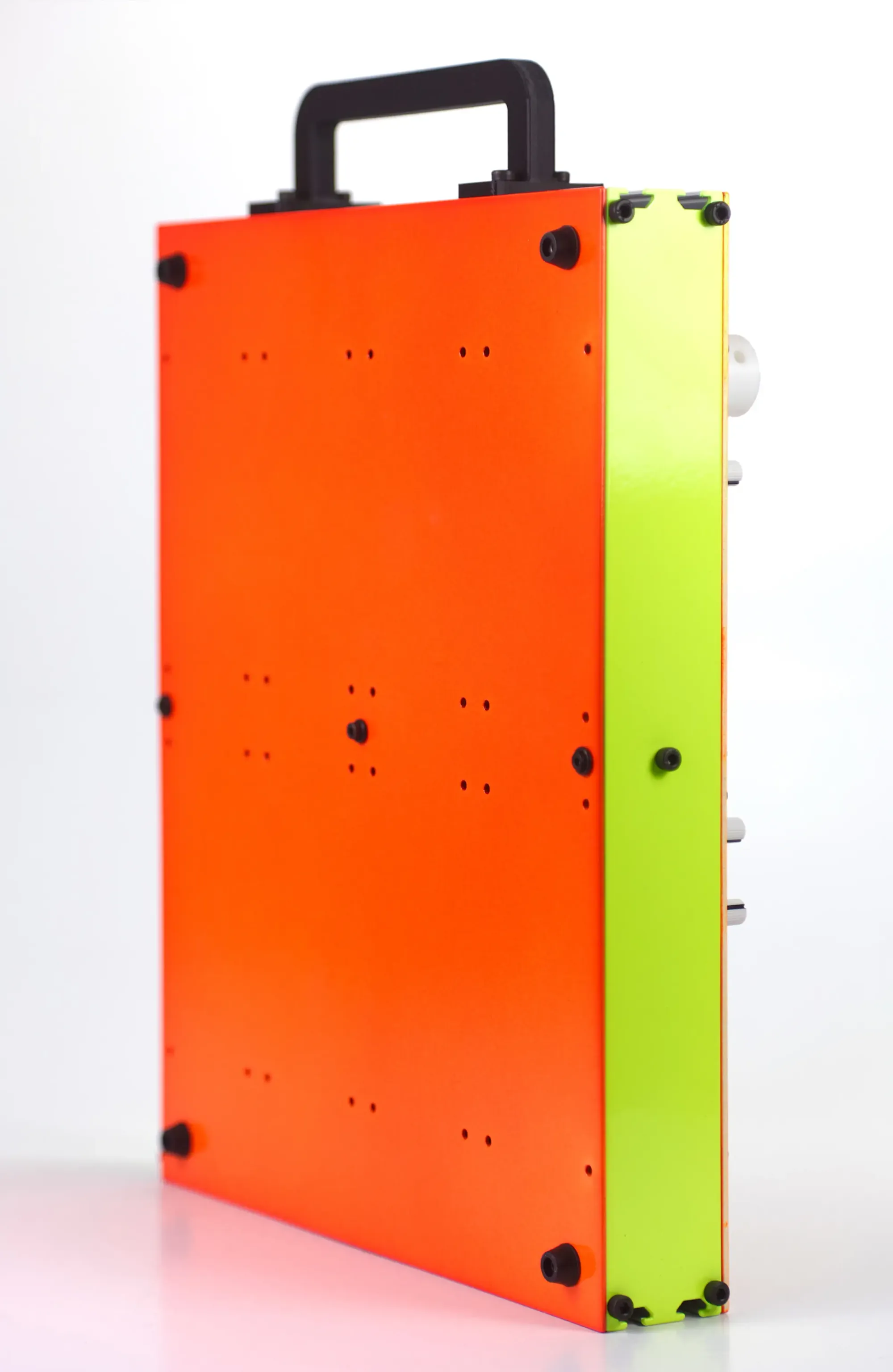 The enclosure is designed by our own Flame, and hand coated by Gábor Kristóf at RAL5050. It's a testament to the rave era of the 90s with ultra-vibrant colors, subtle details and 45° angles.