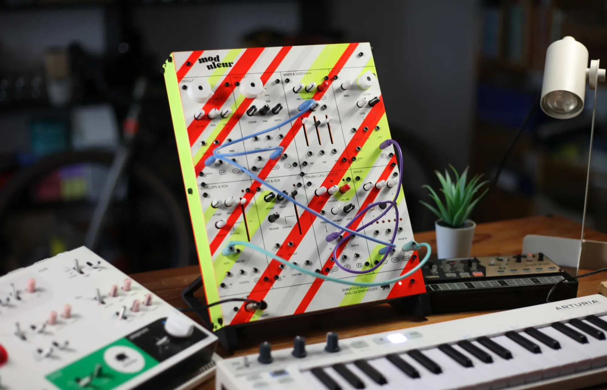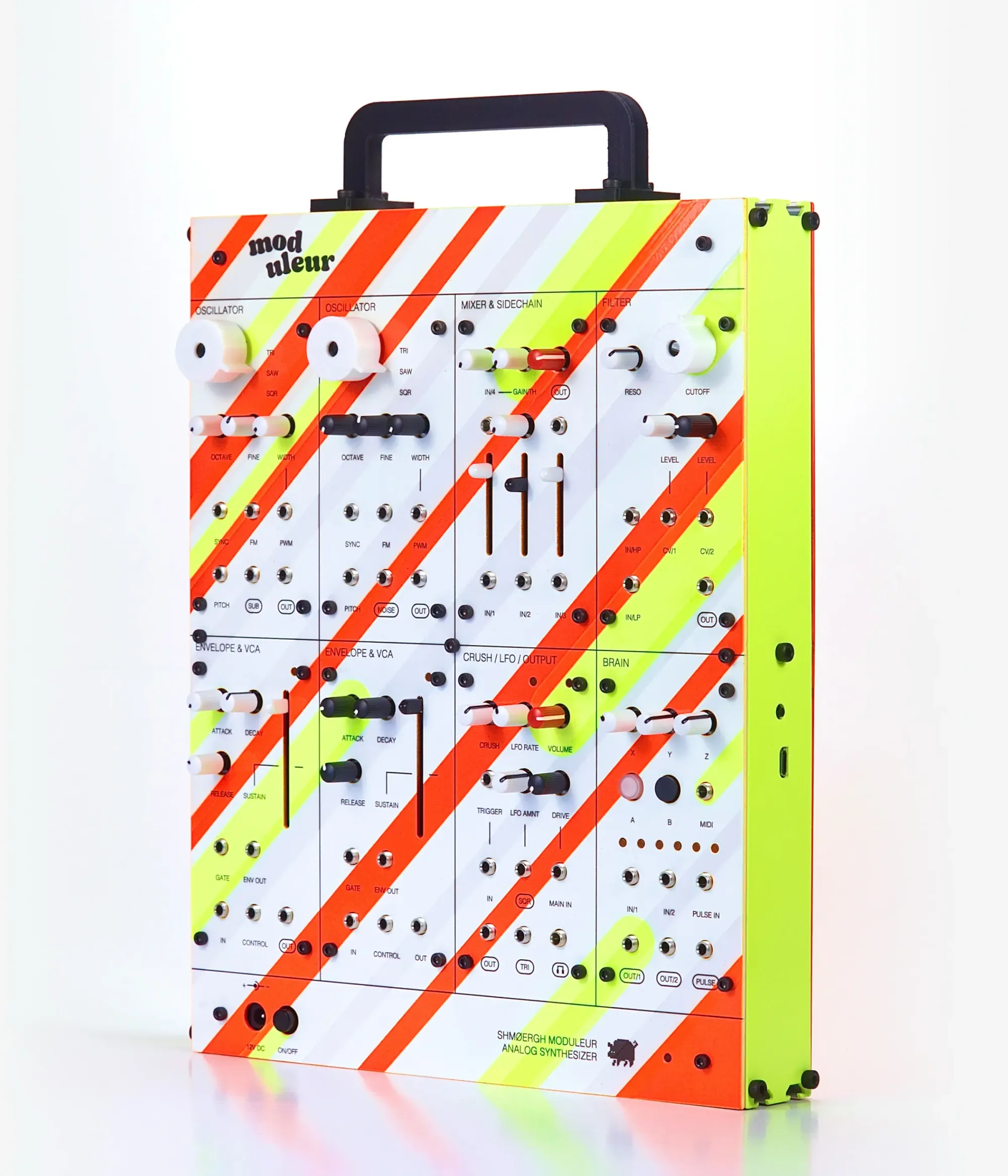 The Moduleur has two VCOs, a mixer with sidechain compressor, a multimode diode filter, two envelope generators with VCA's, a bitcrusher, dual-wave LFO, overdrive, headphones amp, a universal digital brain module. Learn more about the Moduleur
