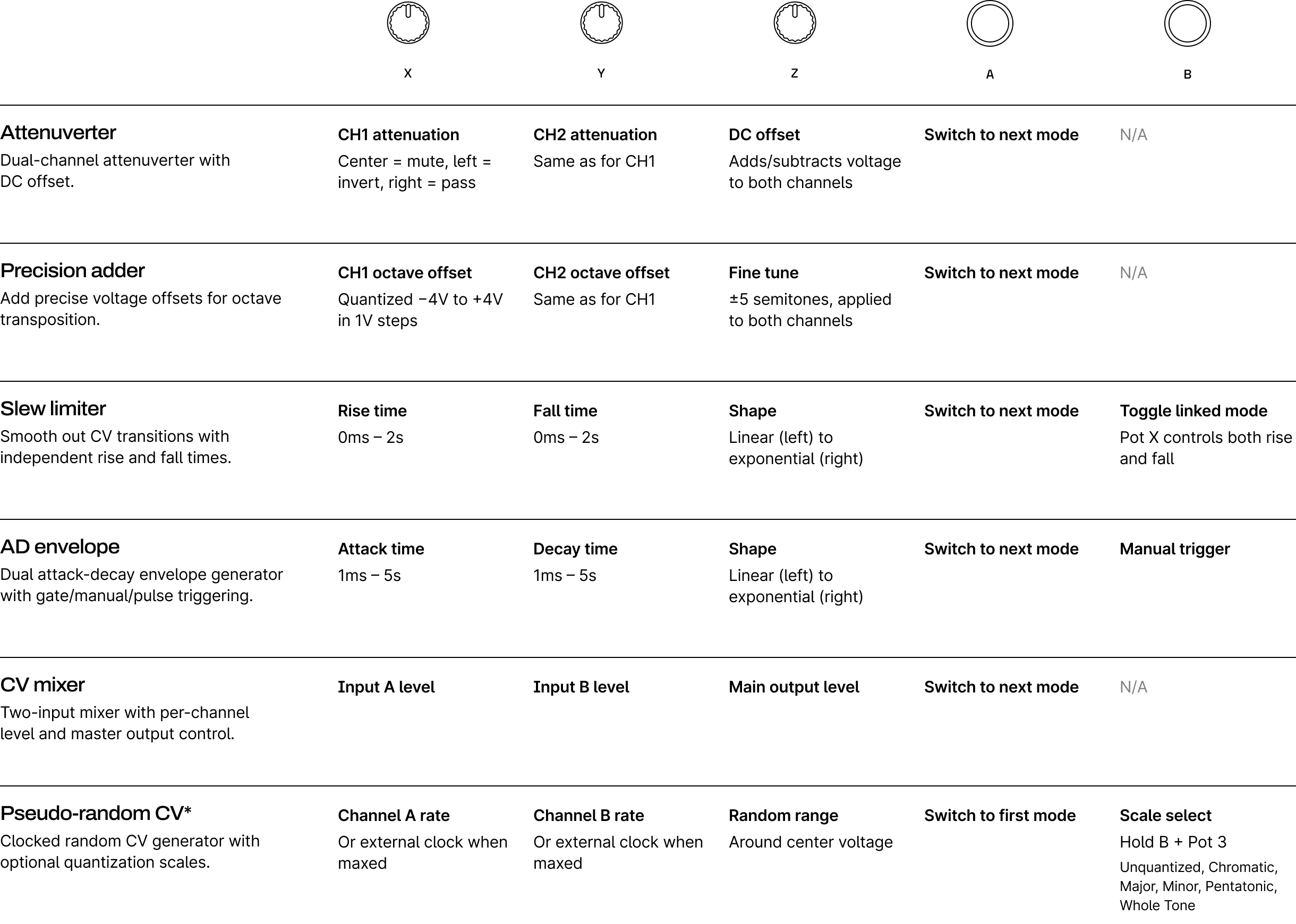 | Pot Z | Fine tune +/-5 semitones, applied to both outs |